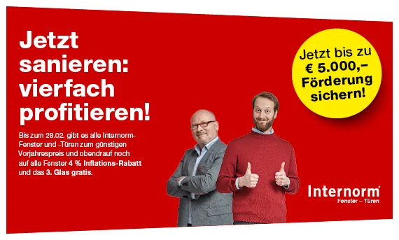 Jetzt sanieren: Vierfach profitieren! Bis zum 28.02.2026 gibt es alle Internorm-Fenster und -Türen zum günstigen Vorjahrespreis und obendrauf noch auf alle Fenster 4% Inflations-Rabatt und das 3. Glas gratis. Sanierer…